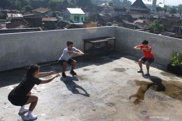 Pebalap sepeda Indonesia, Elga Kharisma (kanan), Crismonita Dwi Putri (kiri) dan Prahesta Dwi Wahyu (tengah) berlatih dalam Pemusatan Latihan di tengah berlanjutnya wabah virus Corona baru di lantai atas Hotel Helios, Malang, Jawa Timur, Selasa (19/5/2020). Latihan untuk menghadapi Olimpiade Tokyo 2021 tersebut dilakukan di tempat terbatas untuk menghindari penularan COVID-19. ANTARA FOTO/Ari Bowo Sucipto/wsj.