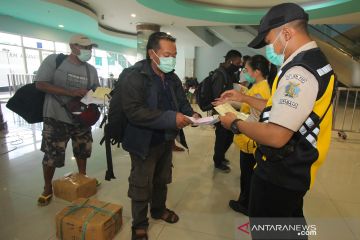 Petugas memeriksa dokumen penumpang kapal KM Kirana IX di Terminal Penumpang Gapura Surya Nusantara, Pelabuhan Tanjung Perak, Surabaya, Jawa Timur, Selasa (19/5/2020). Pada H-5 Lebaran 2020 pemudik kapal laut di Pelabuhan Tanjung Perak Surabaya sampai saat ini terpantu sepi. ANTARA FOTO/Didik Suhartono/pras.