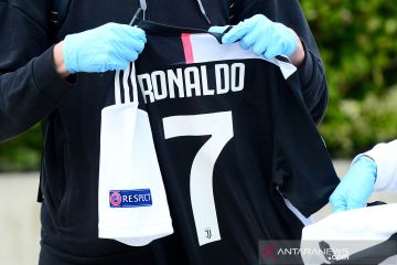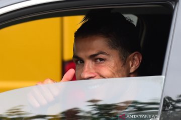 Pemain Juventus Cristiano Ronaldo menyapa wartawan saat meninggalkan pusat latihan Juventus di Turin, Italia, Selasa (19/5/2020). Ronaldo kembali terlihat di kamp latihan Juventus untuk pertama kalinya usai Seria A berhenti akibat pandemi COVID-19. ANTARA FOTO/REUTERS/Alessandro Garofalo/pras.