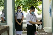 Para siswa yang mengenakan masker antre untuk mencuci tangan di sebuah sekolah di Vientiane, Laos, Selasa (19/5/2020). Pemerintah Laos telah mengumumkan bahwa semua siswa di negara itu dapat kembali bersekolah mulai 2 Juni mendatang, sementara kelas untuk siswa tingkat akhir sekolah dasar, menengah pertama, dan menengah atas sudah dimulai sejak Senin (18/5) kemaren. Kementerian Kesehatan Laos mengumumkan dua kasus terkonfirmasi COVID-19 pertamanya pada 24 Maret lalu melalui konferensi pers harian, dan sejauh ini, negara tersebut telah mendeteksi 19 kasus. ANTARA FOTO/Xinhua/Kaikeo Saiyasane/hp.