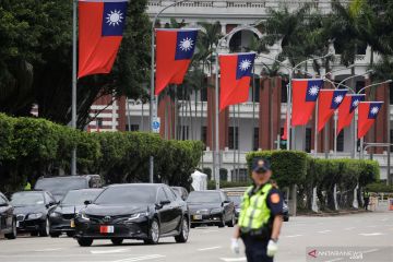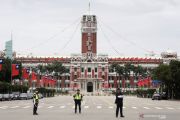 Seorang petugas polisi berjaga di depan gedung kantor Presiden saat berlangsung upacara pelantikan Presiden Taiwan Tsai Ing-wen, di Taipei, Taiwan, Rabu (20/5/2020). ANTARA FOTO/Reuters-Ann Wang/hp.