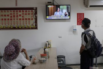 Penduduk setempat menyaksikan lewat sebuah televisi siaran langsung upacara pelantikan Presiden Taiwan Tsai Ing-wen di sebuah restoran, di Taipei, Taiwan, Rabu (20/5/2020). ANTARA FOTO/Reuters-Ann Wang/hp.