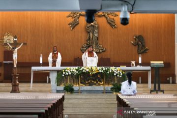 Pastor memimpin ibadah Misa Kenaikan Isa Al Masih di Gereja Santa Maria Regina - Paroki Bintaro Jaya, Tangerang, Banten, Kamis (21/5/2020). Untuk mencegah penyebaran COVID-19, ibadah Misa di gereja tersebut ditiadakan dan diganti dengan menggunakan layanan "Live Streaming". ANTARA FOTO/Rivan Awal Lingga/hp.