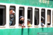 Para penumpang memandang dari dalam gerbong, di sebuah stasiun kereta di Lahore, Pakistan Timur, Rabu (20/5/ 2020). Pakistan pada Rabu (20/5) kemaren telah mengaktifkan kembali sebagian layanan kereta dengan standar operasional prosedur (SOP) kesehatan guna memungkinkan warga merayakan Idul Fitri. ANTARA FOTO/Xinhua-Sajjad/hp.