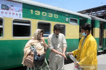(200520) -- LAHORE, 20 Mei, 2020 (Xinhua) -- Para penumpang memasuki gerbong di sebuah stasiun kereta di Lahore, Pakistan timur, pada 20 Mei 2020. Pakistan pada Rabu (20/5) mengaktifkan kembali sebagian layanan kereta dengan standar operasional prosedur (SOP) guna memungkinkan warga merayakan Idul Fitri. (Xinhua/Sajjad)