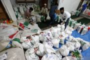 Takmir mempersiapkan beras zakat fitrah untuk disalurkan kepada warga, di Desa Ilie Ulee Kareng, Banda Aceh, Aceh, Sabtu (23/5/2020). Zakat fitrah berupa beras terkumpul disalurkan kepada delapan golongan yakni fakir, miskin, amil, muallaf, hamba sahaya, gharimin, fisabilillah dan ibnu sabil. ANTARA FOTO/Irwansyah Putra/hp.