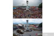 Foto kolase perbandingan suasana libur Lebaran tahun lalu sebelum masa pandemi COVID-19 (atas), dan lebaran tahun 2020 (bawah), di kawasan Jam Gadang Bukittinggi, Sumatera Barat, Senin (25/5/2020). Meskipun masih dalam masa PSBB hingga 29 Mei 2020, objek wisata aikonik di Sumbar itu masih dikunjungi pengunjung. ANTARA FOTO/Iggoy el Fitra/aww.