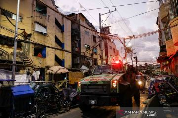 Polisi berpatroli menggunakan kendaraan taktis lapis baja di sekitar rumah-rumah petak sambil mengingatkan penduduk untuk tetap tinggal di dalam rumah di tengah karantina wilayah untuk menekan penyebaran penyakit coronavirus (COVID-19) di daerah kumuh Tondo, Manila, Filipina, Senin (4/5/2020). Foto diambil 4 Mei 2020. ANTARA FOTO/REUTERS/Eloisa/wsj.