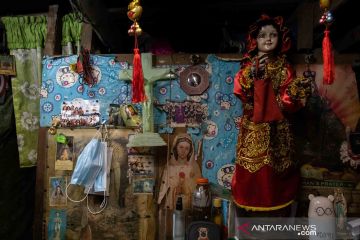 Masker bedah sekali pakai untuk melindungi dari penularan COVID-19 tergantung di dekat altar sembahyang di sebuah rumah gubuk di Kota Manila, Filipina, Rabu (6/5/2020). Foto diambil 6 Mei 2020. ANTARA FOTO/REUTERS/Eloisa lopez/wsj.
