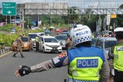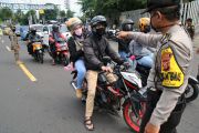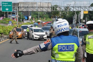 Anggota Polres Bogor menghentikan pengendara motor saat pemeriksaan di Check Pont Pembatasan Sosial Berskala Besar (PSBB), Simpang Gadog, Ciawi, Kabupaten Bogor, Jawa Barat, Rabu (27/5/2020). Kendaraan roda empat maupun dua yang melanggar aturan kebijakan PSBB Kabupaten Bogor di jalur wisata Puncak tersebut akan diputar balik kembali menuju Jakarta. ANTARA FOTO/Arif Firmansyah/hp.