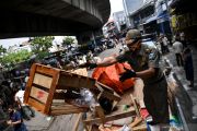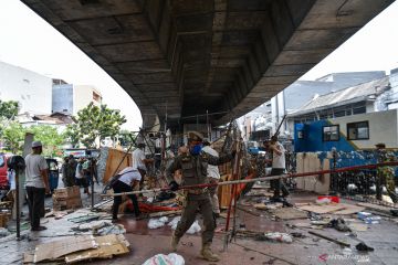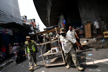 Anggota Satpol PP membersihkan lapak pedagang yang berjualan di kolong jembatan layang Pasar Pagi Asemka, Jakarta Barat, Rabu (27/5/2020). Penertiban oleh Satpol PP di kawasan niaga tersebut untuk mengurangi potensi penularan COVID-19 di tengah berlangsungnya Pembatasan Sosial Berskala Besar di DKI Jakarta. ANTARA FOTO/Sigid Kurniawan/wsj.