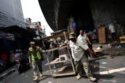 Anggota Satpol PP mengangkut barang-barang milik pedagang yang berjualan di kolong jembatan layang Pasar Pagi Asemka, Jakarta Barat, Rabu (27/5/2020). Penertiban oleh Satpol PP di kawasan niaga tersebut untuk mengurangi potensi penularan COVID-19 di tengah berlangsungnya Pembatasan Sosial Berskala Besar di DKI Jakarta. ANTARA FOTO/Sigid Kurniawan/wsj.