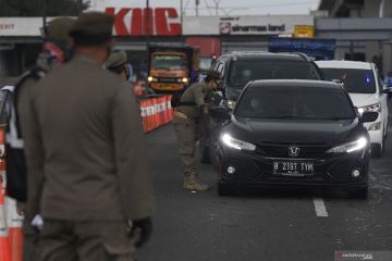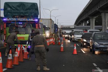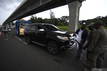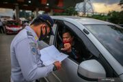 Petugas memeriksa kendaraan di gerbang tol Cikupa, Kabupaten Tangerang, Banten, Rabu (27/5/2020). Petugas memutarbalikkan kendaraan menuju Jakarta yang tidak dilengkapi Surat Ijin Keluar Masuk (SIKM) Jakarta dalam upaya pencegahan penularan COVID-19 sesuai Pergub DKI Jakarta Nomor 47 Tahun 2020. ANTARA FOTO/Fauzan/wsj.