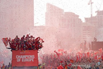 Bus tim Liverpool melakukan perjalanan melewati penggemar selama parade di Liverpool, Inggris, 2 Juni 2019, menyusul kemenangan 2-0 Liga Champions atas rival Liga Premier Inggris Tottenham Hotspur sehari sebelumnya. Juergen Klopp pelatih Liverpool dikalahkan di final oleh Real Madrid pada tahun 2018, tetapi penalti awal oleh Mohamed Salah dan gol menit ke-87 Divock Origi memastikan Piala Eropa keenam mereka di Stadion Wanda Metropolitano di Madrid. ANTARA FOTO/REUTERS/Phil Noble/File photo/aww.