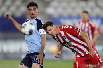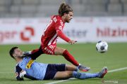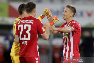 Pesepak bola SC Freiburg Nils Petersen, Dominique Heintz dan Alexander Schwolow melakukan selebrasi setelah pertandingan usai melawan kesebelasan Borussia Moenchengladbach dalam laga pekan ke-30 LIga Jerman yang dilakukan tanpa kehadiran penonton karena masih mewabahnya virus Corona (COVID-19), di Stadion Schwarzwald, Freiburg, Jerman, Jumat (5/6/2020). Freiburg berhasil mengalahkan lawannya dengan skor 1-0 , lewat gol tunggal yang di buat oleh Nils Petersen pada menit ke-58. ANTARA FOTO/pool via Reuters - Ronald Wittek/hp.