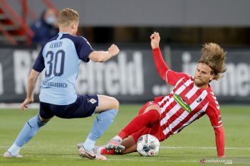 Pesepak bola Borussia Moenchengladbach Ramy Bensebaini (bawah) berebut bola dengan pesepak bola SC Freiburg Lucas Hoeler ,dalam laga pekan ke-30 LIga Jerman yang dilakukan tanpa kehadiran penonton karena masih mewabahnya virus Corona (COVID-19), di Stadion Schwarzwald, Freiburg, Jerman, Jumat (5/6/2020). Freiburg berhasil mengalahkan lawannya dengan skor 1-0 , lewat gol tunggal yang di buat oleh Nils Petersen pada menit ke-58. ANTARA FOTO/pool via Reuters - Ronald Wittek/hp.