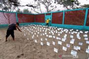 Petugas menandai tempat penetasan telur penyu dengan cara semi alamiah di Pantai Ngagelan, Taman Nasional Alas Purwo, Banyuwangi, Jawa Timur, Minggu (7/6/2020). Petugas penangkaran mengungkapkan, ombak tinggi yang terjadi di pantai selatan mengakibatkan jumlah penyu yang bertelur di kawasan itu menurun. ANTARA FOTO/Budi Candra Setya/pras.