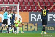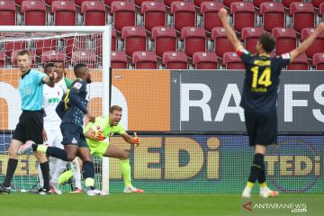 Penjaga gawang FC Augsburg Andreas Luthe (kedua kanan) berteriak gembira setelah rekannya berhasil membobol gawang lawannya FC Cologne dalam laga pekan ke-30 Liga Jerman, di Stadion WWK Arena, Augsburg, Jerman, Minggu (7/6/2020). Augsburg dan Cologne bermain imbang 1-1 dalam pertandingan yang dilakukan tanpa kehadiran penonton karena masih mewabahnya virus Corona. ANTARA FOTO/Reuters-Michael Dalder-Pool/hp.