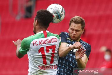 Pesepak bola FC Augsburg Noah Sarenren Bazee (kiri) berebut bola dengan pesepak bola FC Cologne Benno Schmitz dalam laga pekan ke-30 Liga Jerman, di Stadion WWK Arena, Augsburg, Jerman, Minggu (7/6/2020). Augsburg dan Cologne bermain imbang 1-1 dalam pertandingan yang dilakukan tanpa kehadiran penonton karena masih mewabahnya virus Corona. ANTARA FOTO/Reuters-Michael Dalder-Pool/hp.