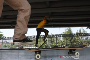 Dua remaja bermain skateboard di Skatepark Pasar Rebo, Jakarta, Minggu (14/6/2020). Skatepark tersebut kembali ramai pengunjung di masa Pembatasan Sosial Berskala Besar (PSBB) transisi meski taman itu belum kembali dibuka untuk umum. ANTARA FOTO/Indrianto Eko Suwarso/aww.