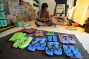 Seorang perajin membuat sandal jepit di Keputran, Kemalang, Klaten, Jawa Tengah, Senin (15/6/2020). Menurut perajin, setelah tidak berproduksi akibat dampak dari pandemi COVID-19, kerajinan sandal jepit yang terbuat dari bahan dasar spon eva tersebut mulai bangkit dan telah memenuhi permintaan awal sebanyak 300 pasang dan dijual dari harga Rp15 ribu hingga Rp17.500 per pasang. ANTARA FOTO/Aloysius Jarot Nugroho/wsj.