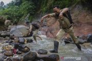 Kepala Sekolah SMP N 4 Bawang Mulud Sugito (kanan) dan guru Wiyata Bhakti melewati aliran sungai di dasar bukit saat mengantar lembar tugas siswa secara langsung ke rumahnya di Pranten, Kecamatan Bawang, Kabupaten Batang, Jawa Tengah. Mereka rela berjalan kaki dengan turun naik bukit sejauh sekitar satu kilometer hingga melewati aliran sungai di dasar bukit. Selain berjalan kaki, ada pula beberapa alternatif jalan lainnya. Namun jarak tempuh perjalanan harus dilalui berputar sejauh lebih kurang 20 kilometer. Para guru memilih untuk melalui jalan tercepat meski harus turun naik bukit guna mengantar materi pembelajaran ke rumah siswa. ANTARA FOTO/Harviyan Perdana Putra/pras.