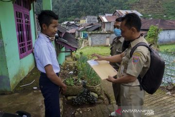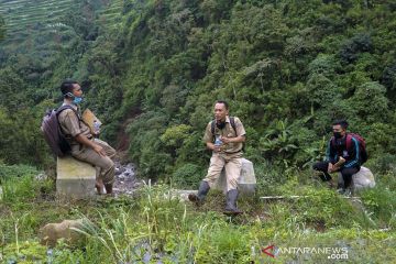 Kepala Sekolah SMP N 4 Bawang Mulud Sugito (kanan) dan guru Wiyata Bhakti menaiki bukit saat mengantar lembar tugas siswa secara langsung ke rumahnya di Pranten, Kecamatan Bawang, Kabupaten Batang, Jawa Tengah. Setiap Senin pagi, kepala sekolah dan guru membagi tugas untuk mengantar tugas sekolah ke rumah siswa. Total keseluruhan siswa kelas VII sampai IX mencapai 43. Namun untuk saat ini, yang masih aktif mengikuti kegiatan belajar mengajar (KBM) hanya kelas VII dan VIII yang berjumlah 35 siswa. Guru harus menyusun program belajar dan tugas yang bisa digunakan siswa saat belajar di rumah selama satu minggu. Kemudian pada hari Sabtu, guru mengambil kembali hasil pengerjaan siswa untuk dikoreksi. ANTARA FOTO/Harviyan Perdana Putra/pras.