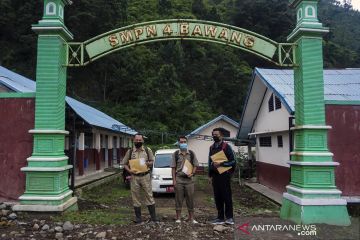 Kepala Sekolah SMP N 4 Bawang Mulud Sugito (kanan) dan guru Wiyata Bhakti berjalan kaki guna mengantar lembar tugas siswa langsung ke rumahnya di Pranten, Kecamatan Bawang, Kabupaten Batang, Jawa Tengah. Tidak semua tenaga pendidik menguasai sistem daring untuk pembelajaran jarak jauh. Siswa pun juga ada yang tidak memiliki telepon genggam. Akhirnya Sugito bersama 11 guru Wiyata Bhakti lainnya sepakat untuk melakukan “jemput bola” dengan mengantar tugas sekolah secara langsung ke rumah siswa. ANTARA FOTO/Harviyan Perdana Putra/pras.