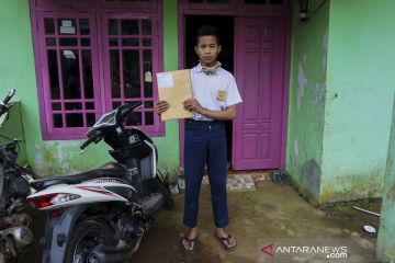 Pelajar SMP N 4 Bawang, Khoerul Risal, menunjukkan amplop berkas lembar tugas yang diantarkan langsung oleh gurunya di Pranten, Kecamatan Bawang, Kabupaten Batang, Jawa Tengah. ANTARA FOTO/Harviyan Perdana Putra/pras.