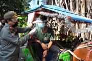 Anggota Satpol PP Kota Bogor membagikan alat pelindung wajah (Face Shield) dan masker untuk pengemudi delman di jalan Juanda, Kota Bogor, Jawa Barat, Minggu (21/6/2020). Pembagian alat pelindung wajah dan masker untuk sejumlah pengemudi delman yang biasa melayani warga berkeliling pedestrian Istana Kepresidenan dan Kebun Raya Bogor tersebut bertujuan untuk memberikan rasa aman dan mencegah penyebaran pandemi COVID-19. ANTARA FOTO/Arif Firmansyah/foc.