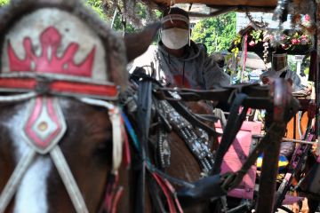 Pengemudi delman menggunakan alat pelindung wajah (Face Shield) dan masker di jalan Juanda, Kota Bogor, Jawa Barat, Minggu (21/6/2020). Pembagian alat pelindung wajah dan masker oleh Satpol PP Kota Bogor untuk sejumlah pengemudi delman yang biasa melayani warga berkeliling pedestrian Istana Kepresidenan dan Kebun Raya Bogor tersebut bertujuan untuk memberikan rasa aman dan mencegah penyebaran pandemi COVID-19. ANTARA FOTO/Arif Firmansyah/foc.