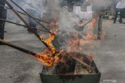 Petugas Kepolisian membakar ganja kering saat pemusnahan barang bukti narkoba di halaman Kantor Lembaga Adat Melayu (LAM) Riau, di Pekanbaru, Riau, Rabu (24/6/2020). Polda Riau memusnahkan barang bukti narkoba berupa pil ekstasi 585 butir, ekstasi serbuk 2.385 gram, sabu-sabu 35,46 kg dan ganja sebanyak 87,6 kg. ANTARA FOTO/Rony Muharrman/hp.