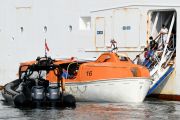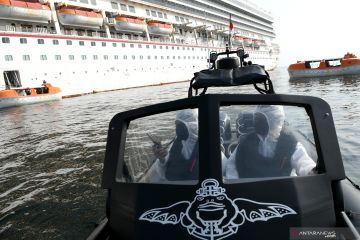 Prajurit Satuan Komando Pasukan Katak (Satkopaska) yang berada di Sea Rider menyaksikan proses evakuasi Warga Negara Indonesia (WNI) yang menjadi Anak Buah Kapal (ABK) Kapal Pesiar MV Carnival Conquest menuju 'Tender Boat' di Perairan Teluk Jakarta, Rabu (24/6/2020). Sebanyak 275 orang WNI terdiri dari 119 orang ABK kapal pesiar MV Carnival Dream dan 156 orang ABK kapal pesiar MV Carnival Conquest tersebut akan menjalani serangkaian tes kesehatan sesuai protokol pencegahan COVID-19 seperti swab test (PCR) sebelum menjalani isolasi mandiri di hotel. ANTARA FOTO/M Risyal Hidayat/hp.