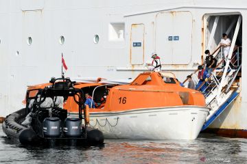 Prajurit Satuan Komando Pasukan Katak (Satkopaska) Koarmada I menyaksikan proses evakuasi Warga Negara Indonesia (WNI) yang menjadi Anak Buah Kapal (ABK) Kapal Pesiar MV Carnival Conquest menuju 'Tender Boat' di Perairan Teluk Jakarta, Rabu (24/6/2020). Sebanyak 275 orang WNI terdiri dari 119 orang ABK kapal pesiar MV Carnival Dream dan 156 orang ABK kapal pesiar MV Carnival Conquest tersebut akan menjalani serangkaian tes kesehatan sesuai protokol pencegahan COVID-19 seperti swab test (PCR) sebelum menjalani isolasi mandiri di hotel. ANTARA FOTO/M Risyal Hidayat/hp.