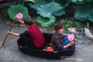 Warga desa mendayung ember untuk memanen bunga dan biji teratai (lotus) di Desa Quanxin, Kota Huzhou, Provinsi Zhejiang, China timur (23/6//2020) waktu setempat. Ember purun tikus (water chestnut) merupakan alat kerja tradisional yang dimiliki setiap rumah tangga dan menggunakannya saat memancing, serta mengumpulkan purun tikus bunga dan biji teratai (lotus). ANTARA/XINHUA/Xu Yu/aa.