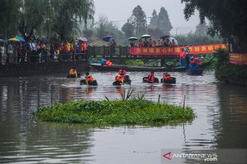 Warga desa berpartisipasi dalam kontes mendayung ember di Desa Quanxin, Kota Huzhou, Provinsi Zhejiang, China timur (23/6//2020) waktu setempat. Ember purun tikus (water chestnut) merupakan alat kerja tradisional yang dimiliki setiap rumah tangga di kota-kota perairan di China. Warga desa menggunakannya saat memancing, dan mengumpulkan purun tikus serta bunga dan biji teratai (lotus). ANTARA/XINHUA/Xu Yu/aa.