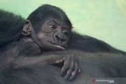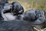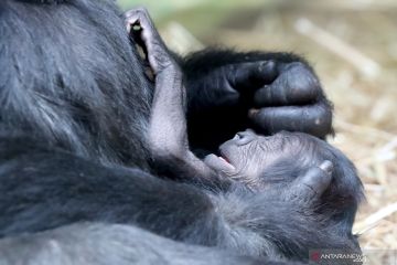 Seekor bayi gorila dataran rendah Barat yang baru lahir terlihat bersama induknya Mambele, di kebun binatang Antwerp, di Antwerp, Belgia , Kamis (25/6/2020). 25 Juni 2020. ANTARA FOTO/Reuters-Yves Herman/hp