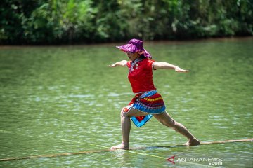 Seorang wanita seniman olah tubuh melakukan atraksi meniti satu bambu di atas air di Chishui, Provinsi Guizhou, China barat daya (25/6/2020). Seni meniti satu bambu berasal dari Guizhou, China, yang mengharuskan seseorang untuk berdiri atau duduk di atas sebatang bambu sembari melakukan gerakan keseimbangan. ANTARA/XINHUA/Tao Liang/aa.