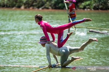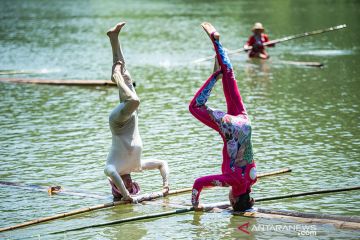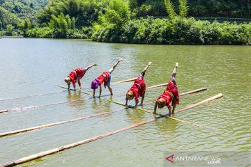 Sejumlah wanita seniman olah tubuh melakukan atraksi meniti satu bambu di atas air di Chishui, Provinsi Guizhou, China barat daya (25/6/2020). Seni meniti satu bambu berasal dari Guizhou, China, yang mengharuskan seseorang untuk berdiri atau duduk di atas sebatang bambu sembari melakukan gerakan keseimbangan. ANTARA/XINHUA/Tao Liang/aa.