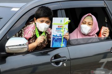 Seorang murid memperlihatkan medalli kelulusan dan buku kenangan saat acara wisuda yang digelar secara "drive thru" di SDI Annajah, Ciledug, Jakarta, Sabtu (27/6/2020). Kegiatan wisuda "drive thru" di sekolah tersebut bertujuan untuk mencegah penyebaran COVID-19 di era normal baru. ANTARA FOTO/Rivan Awal Lingga/hp.