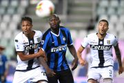 Pesepak bola Inter Milan Romelu Lukaku (tengah) berebut bola dengan pesepak bola Parma Bruno Alves (kiri) dan Kastriot Dermaku (kanan) dalam laga pekan ke-28 Liga Italia, di Stadion Ennio Tardini, Parma, Italia, Minggu (28/6/2020). Inter berhasil mengalahkan tuan rumah 2-1 dalam pertandingan yang dilakukan tertutup tanpa kehadiran penonton karena masih mewabahnya virus Corona (COVID-19). ANTARA FOTO/Reuters- Jennifer Lorenzini/hp.