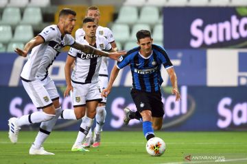 Pesepak bola Inter Milan Roberto Gagliardini (kanan) membawa bola di bayangi pemain belakang Parma Kastriot Dermaku (kiri) dalam laga pekan ke-28 Liga Italia, di Stadion Ennio Tardini, Parma, Italia, Minggu (28/6/2020). Inter berhasil mengalahkan tuan rumah 2-1 dalam pertandingan yang dilakukan tertutup tanpa kehadiran penonton karena masih mewabahnya virus Corona (COVID-19). ANTARA FOTO/Reuters- Jennifer Lorenzini/hp.
