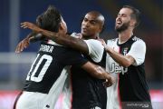 Pesepak bola Juventus Douglas Costa (kiri) melakukan selebrasi bersama rekan-rekannya setelah berhasil mencetak gol ketiga untuk tim nya saat melwan Genoa dalam laga pekan ke-29 Liga Italia, di Stadion Comunale Luigi Ferraris, Genoa, Italia, Selasa (30/6/2020). Pertandingan ini dilakukan tertutup tanpa kehadiran penonton karena masih mewabahnya virus Corona (COVID-19) dimenangkan tim tamu Juventus yang mengalahkan tuan rumah Genoa 3-1. ANTARA FOTO/Reuters-Jennifer Lorenzini/hp.