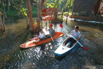 Wisatawan bermain kano di Rowo Cacalan, Banyuwangi, Jawa Timur, Sabtu (4/7/2020). Wahana bermain kano merupakan salah satu wisata yang ramai dikunjungi sejak dibukanya kembali tempat wisata di Banyuwangi yang telah terverifikasi sehat oleh Gugus Tugas Percepatan Penanganan COVID-19. ANTARA FOTO/Budi Candra Setya/wsj.
