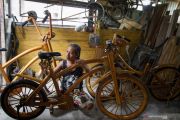 Perajin menyelesaikan pembuatan sepeda kayu di Pucangan, Kartasura, Sukoharjo, Jawa Tengah, Selasa (7/7/2020). Perajin membutuhkan waktu satu bulan untuk menyelesaikan kerajinan sepeda dari limbah kayu jati dan mahoni tersebut yang dijual dengan harga Rp5 juta hingga Rp7,5 juta tergantung tingkat kerumitan pembuatan. ANTARA FOTO/Mohammad Ayudha/wsj.