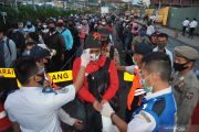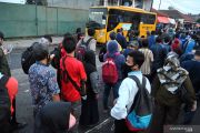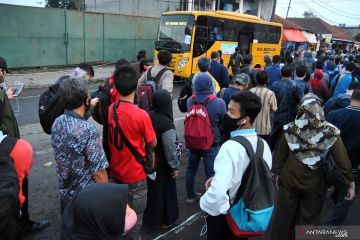 Sejumlah calon penumpang antre untuk naik bus bantuan gratis di jalan Mayor Oking, Kota Bogor, Jawa Barat, Senin (13/7/2020). Pemerintah Pusat bersama Pemerintah Provinsi DKI Jakarta memberikan bantuan 150 unit bus untuk Pemerintah Kota Bogor sebagai upaya mengurangi kepadatan penumpang KRL Comutter Line di Stasiun Bogor. ANTARA FOTO/Arif Firmansyah/hp.