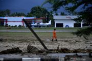 Petugas berjalan di area Bandar Udara Andi Djemma yang tertimbun lumpur akibat terjangan banjir bandang di Kecamatan Masammba, Kabupaten Luwu Utara, Sulawesi Selatan, Rabu (15/7/2020). Banjir bandang yang terjadi akibat tingginya curah hujan tersebut mengakibatkan 16 orang meninggal dunia dan puluhan warga dilaporkan masih dalam pencarian, sementara ratusan rumah rusak berat dan hilang.ANTARA FOTO/Abriawan Abhe/hp.