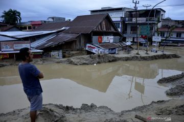 Warga memerhatikan rumah yang tertimbun lumpur akibat terjangan banjir bandang di Kecamatan Masammba, Kabupaten Luwu Utara, Sulawesi Selatan, Rabu (15/7/2020). Banjir bandang yang terjadi akibat tingginya curah hujan tersebut mengakibatkan 16 orang meninggal dunia dan puluhan warga dilaporkan masih dalam pencarian, sementara ratusan rumah rusak berat dan hilang.ANTARA FOTO/Abriawan Abhe/hp