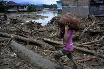 Warga menyelamatkan barang miliknya di sekitar rumah yang tertimbun lumpur dan batang pohon akibat terjangan banjir bandang di Kecamatan Masammba, Kabupaten Luwu Utara, Sulawesi Selatan, Rabu (15/7/2020). Banjir bandang yang terjadi akibat tingginya curah hujan tersebut mengakibatkan 16 orang meninggal dunia dan puluhan warga dilaporkan masih dalam pencarian, sementara ratusan rumah rusak berat dan hilang.ANTARA FOTO/Abriawan Abhe/hp.