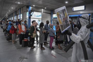 Anggota Komunitas Pecinta Transjakarta mengenakan baju hazmat dengan membawa poster berisi informasi jumlah kasus positif COVID-19 di Jakarta saat melakukan sosialisasi protokol kesehatan di Halte Transjakarta Harmoni, Jakarta, Rabu (15/7/2020). Sosialisasi tersebut untuk mengingatkan penumpang Transjakarta agar selalu menaati protokol kesehatan saat menggunakan transportasi publik guna mengantisipasi penyebaran COVID-19. ANTARA FOTO/Wahyu Putro A/wsj.